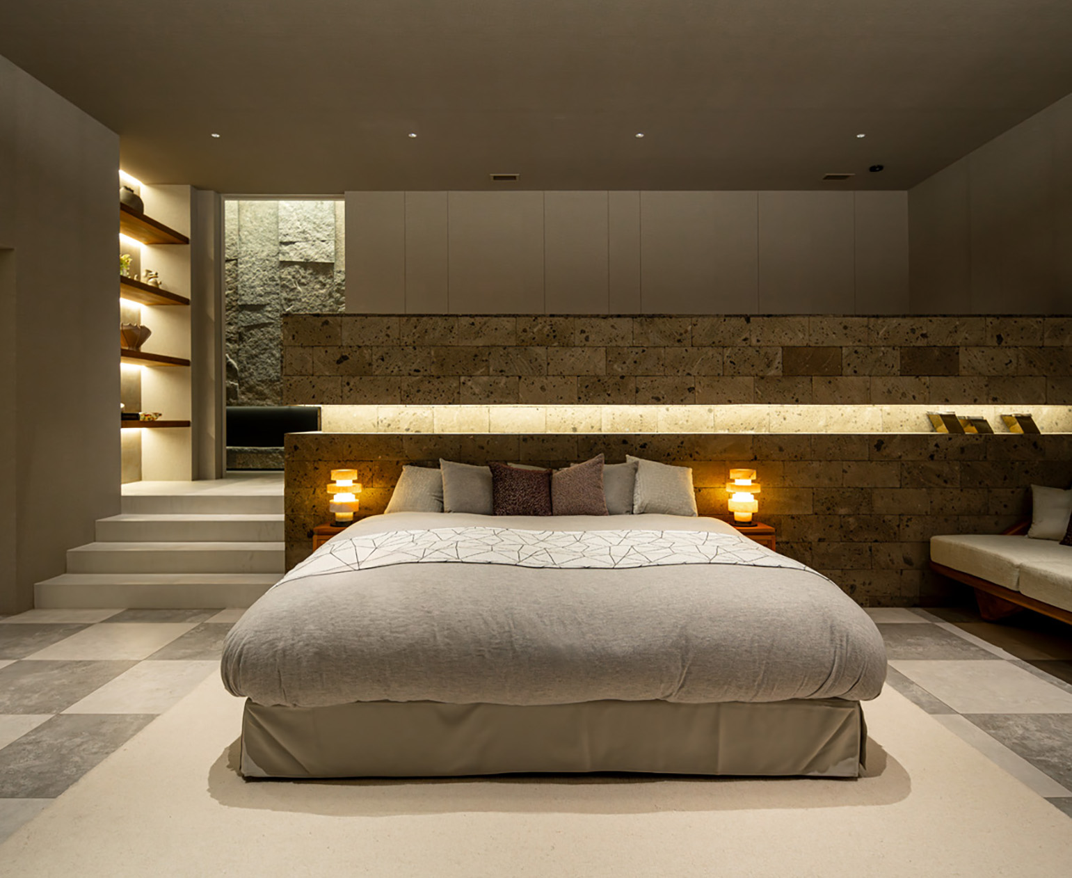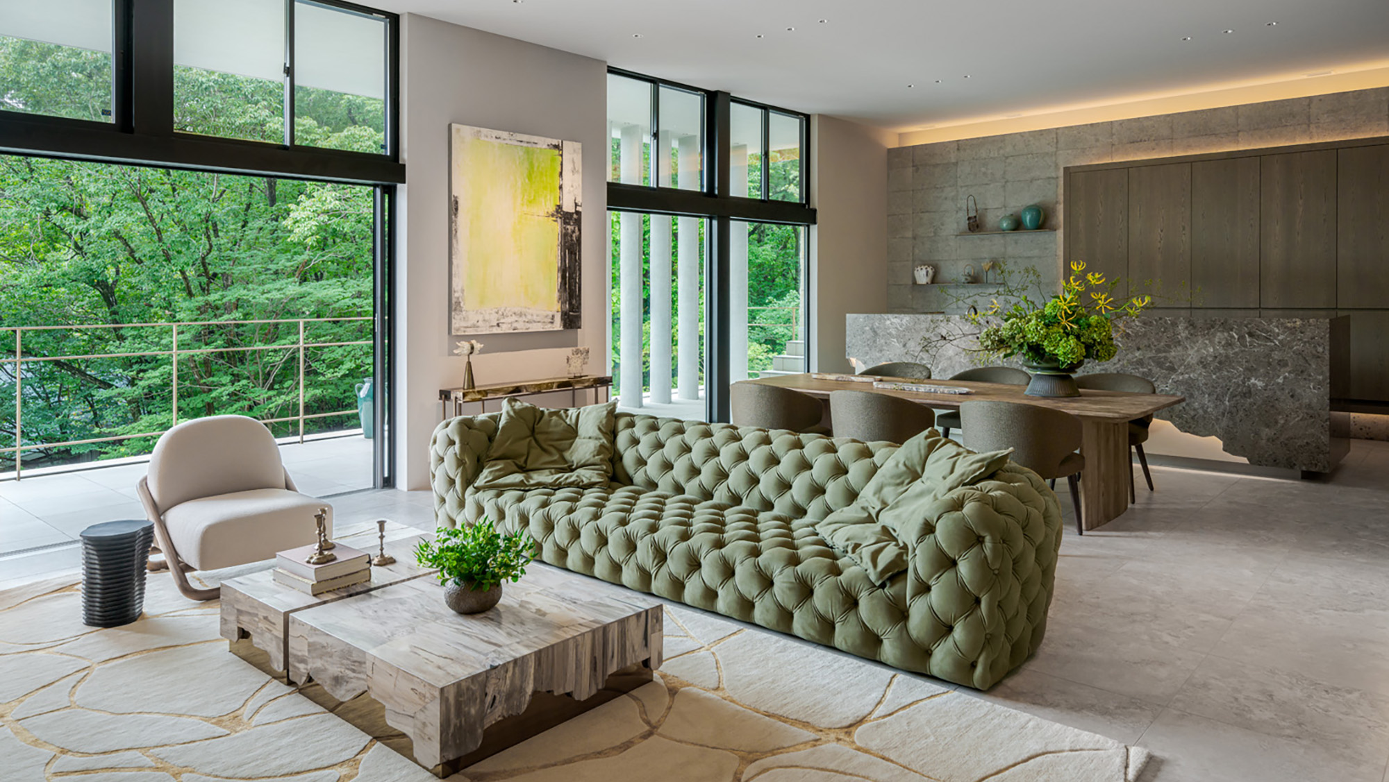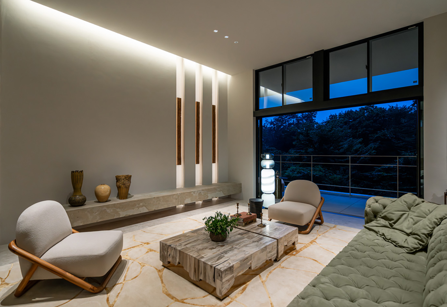 無垢材や石などの自然素材がもたらす温もりと、選び抜かれた家具や照明が放つアートのような美しさ。